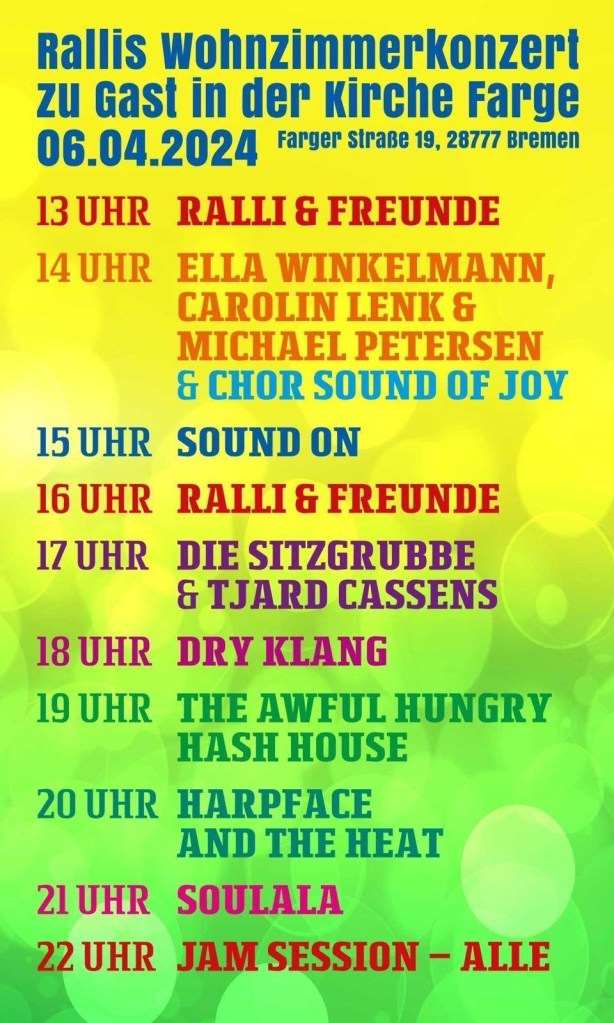 Harpface and the Heat, Ella Winkelmann mit Carolin Lenk und Michael Petersen, Ella Winkelmann mit Chor Sound of Joy, Dry Klang, Sound On, The Awful Hungry Hash House, Die Sitzgrubbe und Tjard Cassens, Soulala, Ralli und Freunde (Joey Lamprecht, Anja Kunde, Heiner Maass, Tom Fritsch, Jürgen Fastje, Helga Fastje, Rüdiger Estrup, Olli und Üv, Mareike Christ, Jule Kraus, Stefan Pelikan)